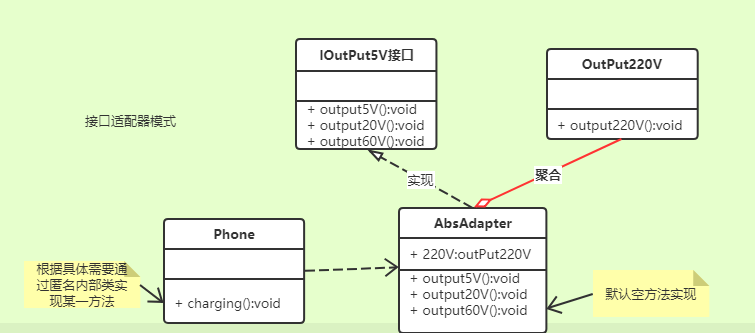 假定现在的目标接口定义了输出5v、输出20v、输出60v的方法