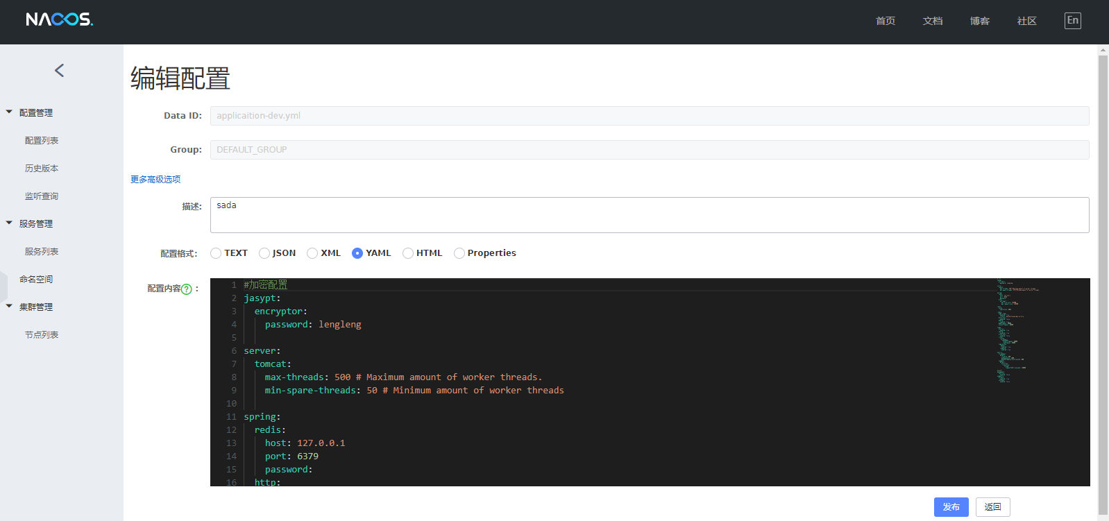 接触过SpringCloud应该对config有所了解,那么配置中心也就很好理解,Nacos支持动态的配置管理,将服务的配置信息分环境分类别外部管理,并且支持热更新。不过与Config不同Nacos的配置信息存储与数据库中,支持配置信息的监听和版本回滚。
