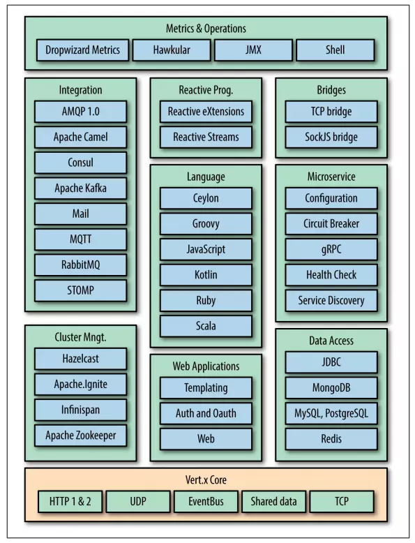 与我们熟悉的spring类似,Vert.x拥有完善的生态,使用vert.x可以完成一个应用的所有开发工作,可以实现一个完全异步处理的应用。它拥有类似于spring全家桶的生态体系,具体如下:
